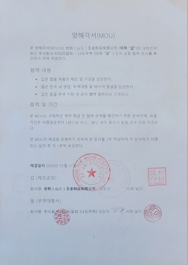 수출입 무역 업무대행 전문 "나도무역" 중국 산동성 린이시 世和(山东)五金制品有限公司 스허우진 공식파트너 사업영역 1. 중국 (유)스허우진 공장 공식협력파트너 제조·철물 무역대행 각종 철물 자동용접 절곡 제조후 한국으로 수출 가능합니다 2. 각종 자재 발굴 탐색 무역 국내 제조 원가 절감을 위해 고민중인 대표님들 소재·부자재 무역을 수행합니다.” 3. 고부가가치 한정판 소싱무역 국내에 단종되었거나 없는 고부가가치(명품시계,가방 등) 제품 및 리미티드 에디션 소싱 무역 4. 다이아몬드 위탁가공무역 시계 악세사리 등에 랩,천연 다이아몬드 세팅이 필요하신분 한국 최대50%가격에 위탁가공 나도무역 팀은 해외(중국) 에 체류중인 경우가많아 연락부재시 카카오채널 메시지를 남겨주시면 빠른답변 드리겠습니다. 카카오톡 하기 클릭 (카카오채널에서 "나도무역" 검색) 전화문자 하기 클릭 (070-8058-9112 문자수신가능)